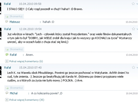 I jeszcze pogrzeb na Wawelu, gdzie le偶膮 sami wybitni ludzie, maj膮cy jakie艣 zas艂ugi dla kraju, a tu nagle chowaj膮 tego grubego paso偶yta, to tak jakby do szkatu艂ki pe艂nej z艂ota, w艂o偶y膰 g贸wno. Jeszcze powinni go pochowa膰 w Watykanie i zrobi膰 z Niego 艣wi臋tego!! “艢w. Lech Kaczy艅ski, ostatni kr贸l polski”.